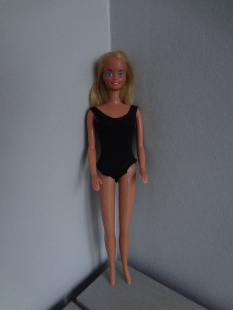 Barbie (Philippa), från sent 70-tal el tidigt 80-tal, stämplad 1966 i Filippinerna. Kan vara en Sports Star, Jogging- eller en Acapulco Beach Barbie. Hon saknade originalkäder så hon får här posera i en svart baddräkt sydd av okänd. Jag har köpt henne på Erikshjälpen, Sundsvall, 2019, om jag minns rätt. Hon är(var) i lag med: