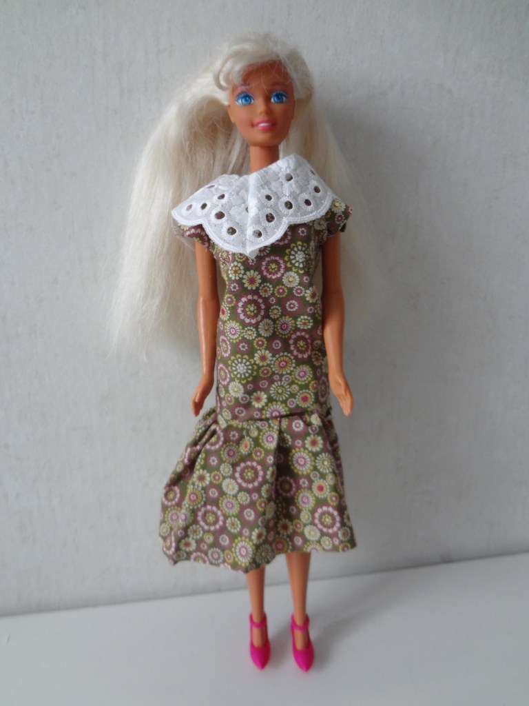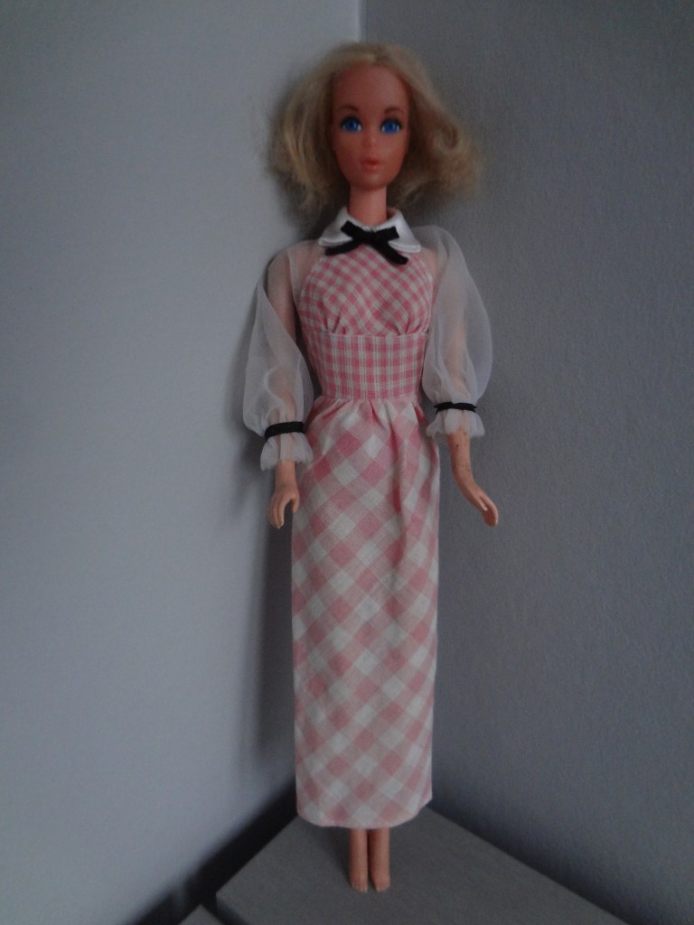 Barbie? (Farrah?), stämplad 1966, Japan (??). Länge varit helt fel ute vilken sorts Barbie, men tittar jag noga så är hon mest lik en Hair Fair Barbie från tidigt 70-tal! Och 28/9 -24 så har jag insett att Hair Fair Barbie var ETT HUVUD med en massa hårförlängningar! Så kroppen hör alltså till en annan docka! Tror hon är köpt på Myrorna i Birsta, någon gång mellan -95 och 2011. Hon bär en 60-talsklänning. Då kroppen är stämplad i Japan är den nog från slutet av 60- el. tidigt 70-tal.