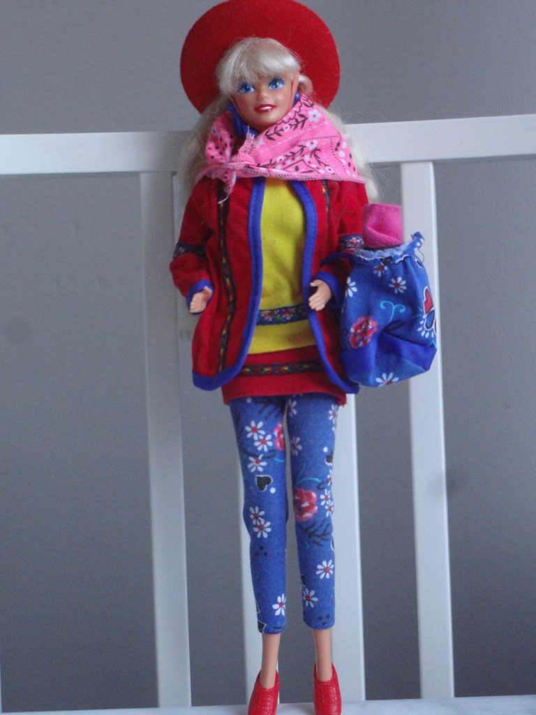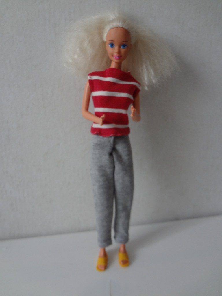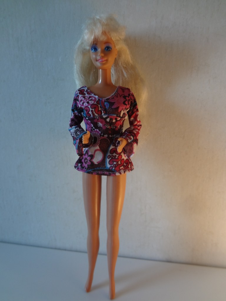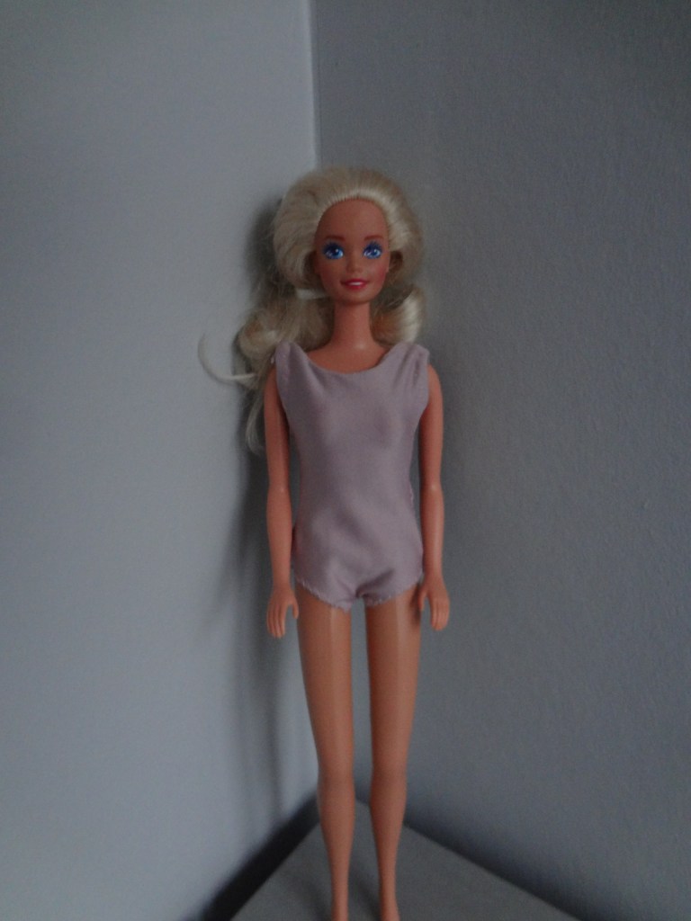 Barbie (Barbara), stämplad 1966, Kina, om jag minns rätt, köpt på Myrorna. Jag går bet på modellen, och det är oerhört svårt utan ledtrådar att veta exakt vilken sorts Barbie det är! Man får titta på hår, ansiktsmålning och armar. en av 80-talet är ganska klart, möjligen tidigt 90-. Men sen..? Fashion Play, Beach Time? Kanske Trail Blazin’ Barbie? Hon hade inte heller några originalkläder utan har fått en baddräkt jag sytt 2020. Hon är i lag med: