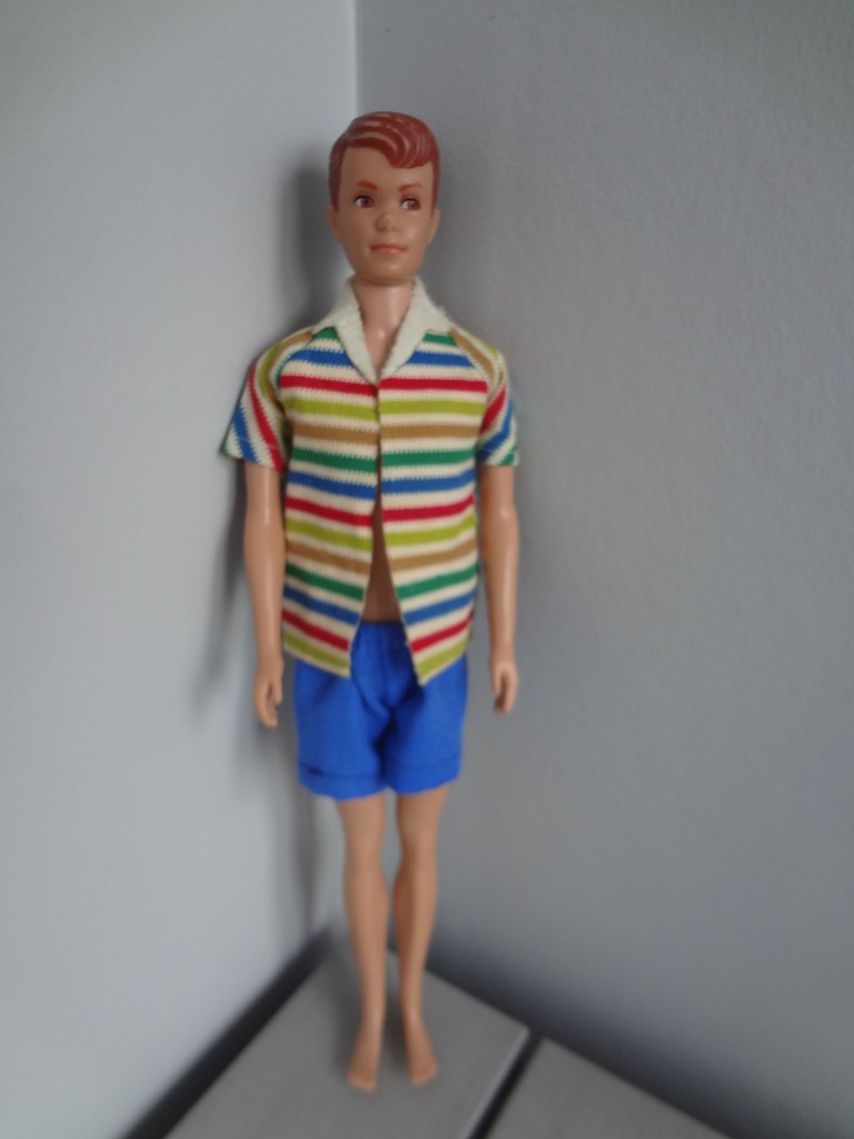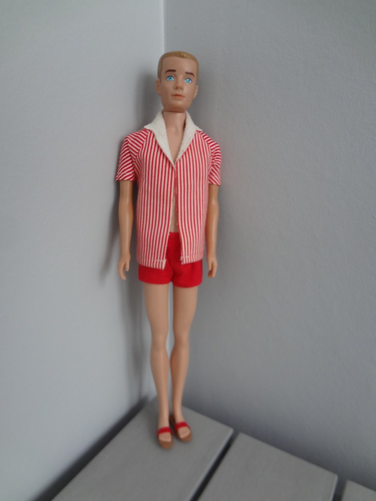 Allan Sherwood, också Straight Leg, 1960, klädd i strandjacka original men hemsydda badbyxor. Han är pojkvän till Midge. Både Ken och Allan är köpta från Dockbutiken i Göteborg, vårvintern 2021.