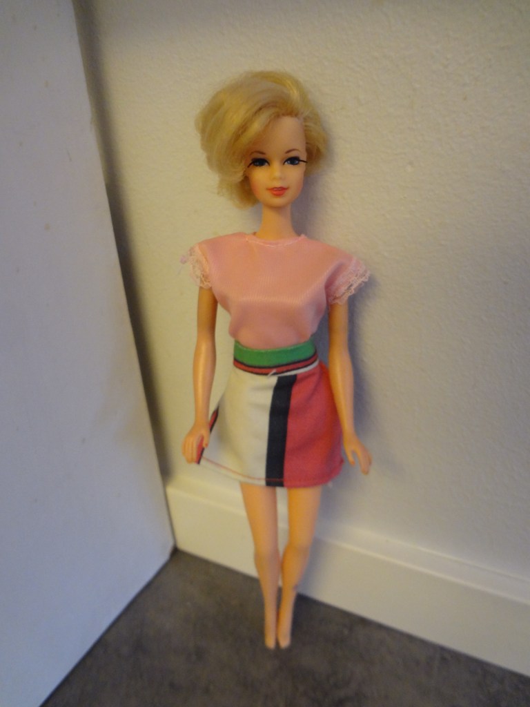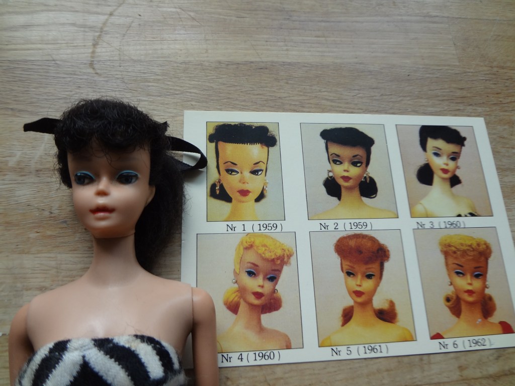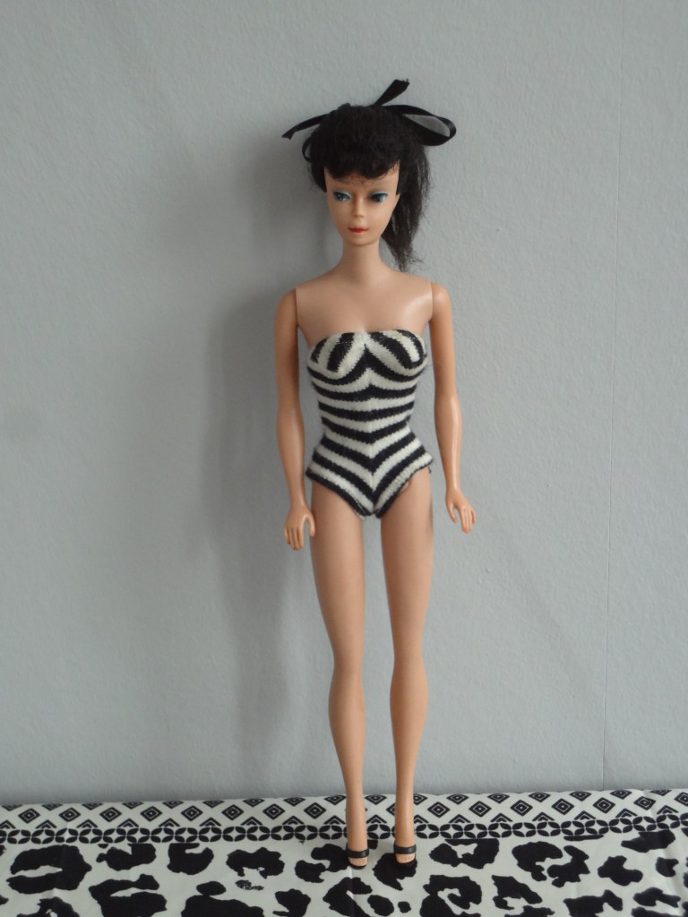 Barbie Bubblecut, en så kallad straight leg, 1959, klädd i originalbaddräkten. Det här är min första Barbie-docka som jag fick i slutet av 60-talet. Jag var för liten för att uppskatta den då, och egentligen under hela min barndom, men nu tycker jag att hon är cool! Tyvärr kan hon inte längre räknas som original för jag hade precis förbättrat hennes läppar när jag läste att man inte ska måla på originaldockor… Men hon kommer alltid att ha ett affektionsvärde för mig!