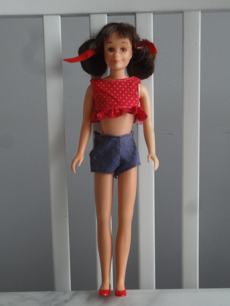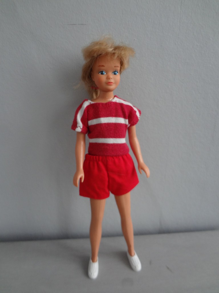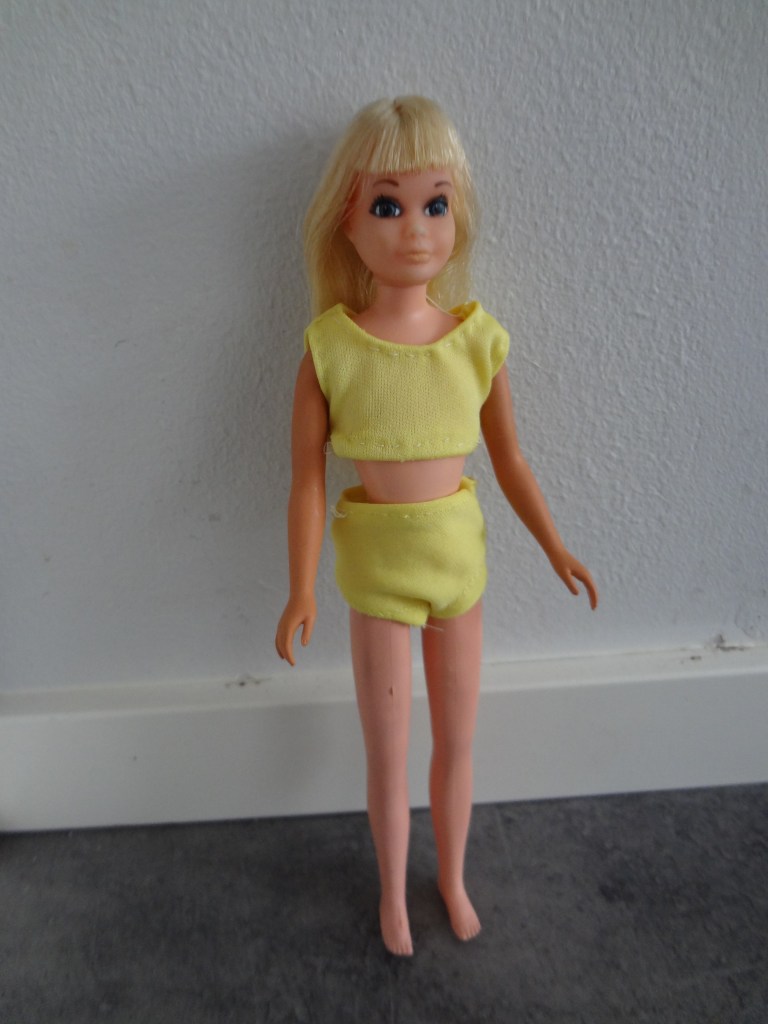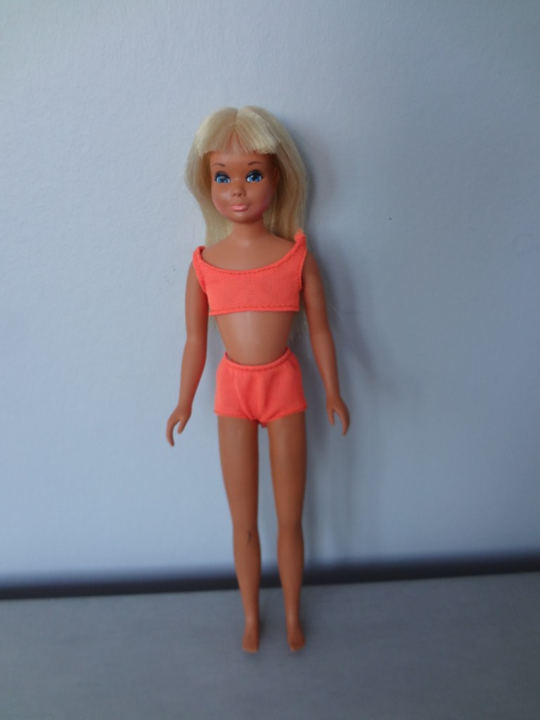 Fun Time Skipper Europa (Fanny), stämplad 2 på höger skinka och 1969(?) Mattel Inc US Pat´d, Korea på höger skinka. Köpt från Dockbutiken i mars -23 och iklädd hemsydd bikini med originalets dito som förlaga. Hon är lillasyster till Tiffany och Timothea.