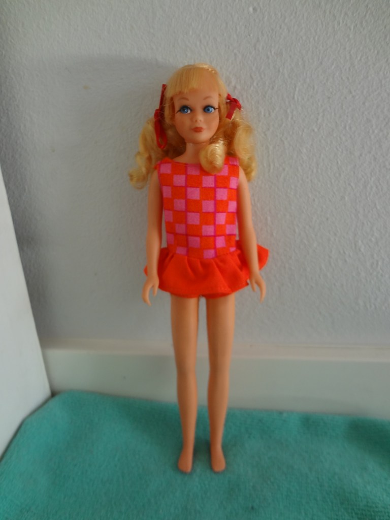 Skipper Straight Leg, 1963, Barbies lillasyster, klädd i originalbaddräkt. Min Barbie fick vänta länge på att få återförenas med henne, då jag köpte henne 2021! Hon är köpt från Dockbutiken i Göteborg. Tyvärr är håret lite klippt, i övrigt är hon i fint skick.
