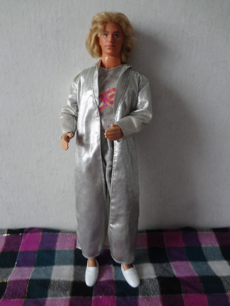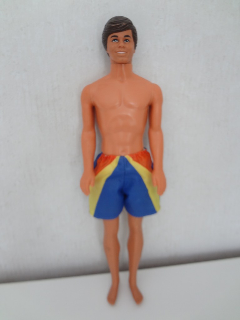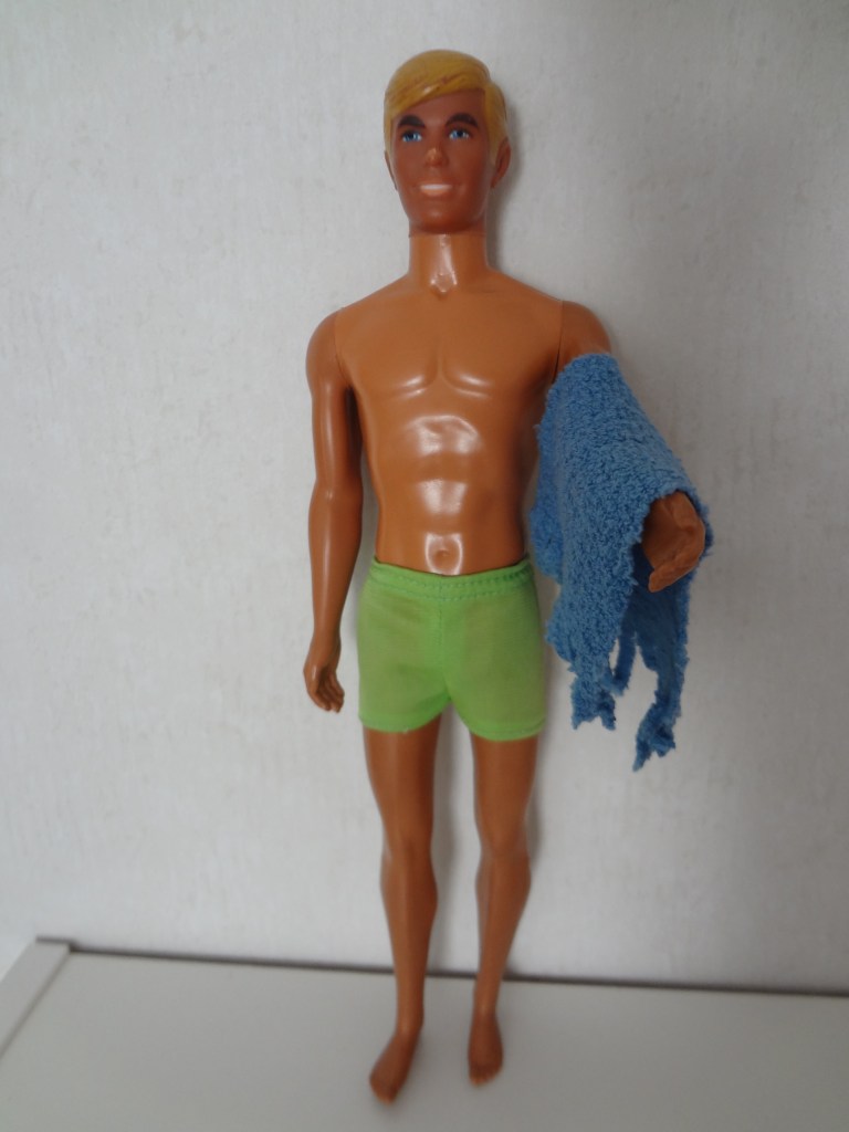 Ken (Kennet), stämplad 1969?, Malaysia. Vet inte exakt vilken modell han är, och han hade inga originalkläder. Han har fått ett par badshorts från okänd docka. Ganska säker dock att han är från 1990, en My First, Weekend, All American eller Hawaiian Fun – Ken. Kan tillägga att han, Barbara och Matt är köpta vid samma tillfälle som Farrah, från Myrorna, någon gång mellan -95 och 2011.