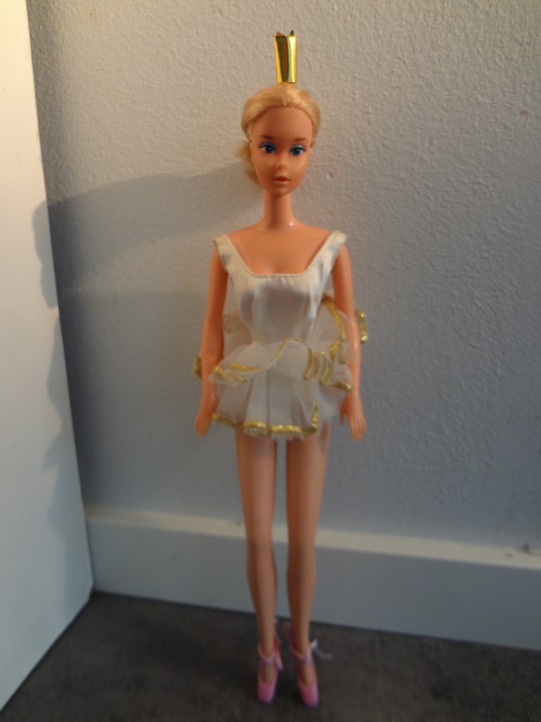 Barbie Ballerina (Nina) från -76/-78, stämplad 1966, Taiwan. Hon är köpt från Dockbutiken oktober -23 och jag är ganska säker på att en av mina klasskompisar hade en sån här. Jag har gjort en krona och balettskorna hade jag sen tidigare. Dräkten är original.