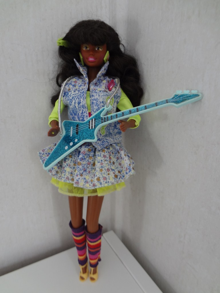 Chrissie, Princess m.fl. får en till väninna när The Rockers Barbie (Roxanne) stämplad 1966, Philippines, från 1987 flyttar in. Hon är köpt från Dockbutiken i juni -24 och hade inte originalkläder utan delar av outfiten The Rockers Concert Tour från -86/-87.