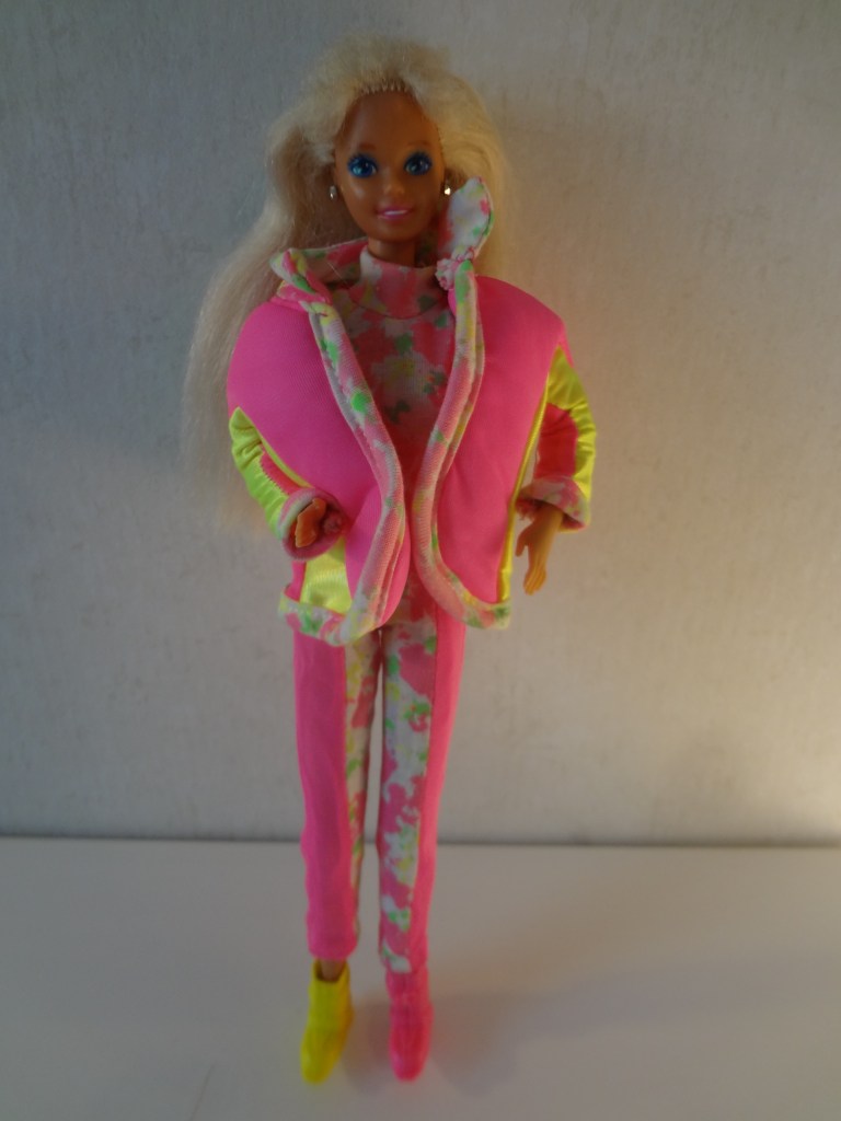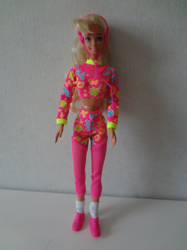 Working out Barbie (Wendy) , stämplad 1993, Indonesia, köpt från Dockbutiken i juli 2024. Klädseln är komplett, men det saknas en del tillbehör, bland annat ett kassettband med musik!