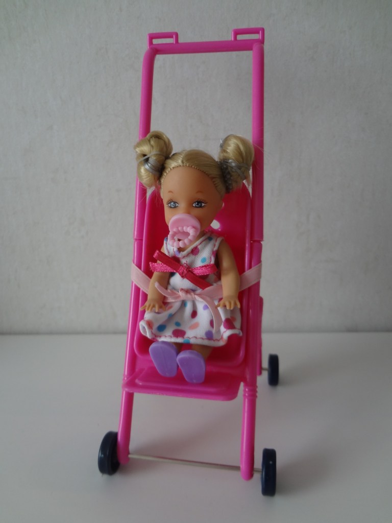 Inte alls tänkt köpa en så här liten docka, men hon var ju oemotståndlig där hon fanns på Mitt secondhand, Härnösand, i juli -24. Lite osäker, men det KAN vara en Kelly från 80- el. 90-tal. Just nu vet jag inte om hon blir barn eller lillasyster och inte till vilken Barbie heller… Det får ge sig med tiden.