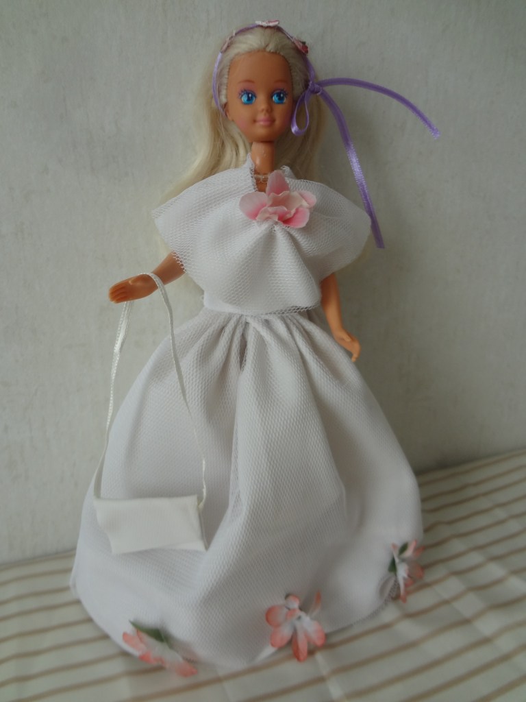 Det här kan vara någon av de ikoniska dockorna Dream Date fr. -82, Peaches ‘n’ Cream eller Day to Night fr. -84. Hon är stämplad -66, Malaysia och fyndades i oktober – 25 på Mitt second hand, Skönsberg. Hon får heta Daniela. Tyvärr är håret klippt, men hon är fin och jag har köpt en Dream Date-outfit åt henne från Dockbutiken. Toppen saknades, så jag har sytt en ny av en julstrumpa. Pillrigt, men så nöjd!