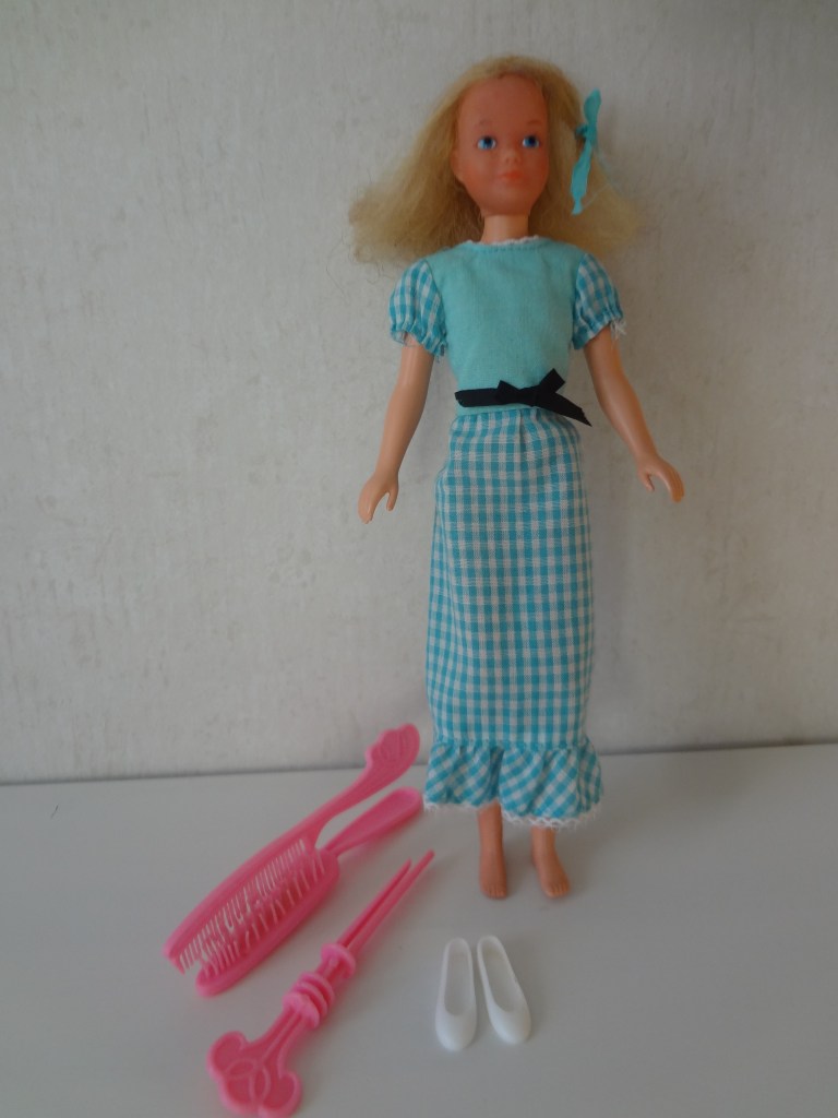 Bland fynden på Mitt second hand, Skönsberg i augusti -25 hittade jag en Quick Curl Skipper (Carly) från -72, stämplad Taiwan -68. Hon hade originalklänning och alla (?) tillbehör! Hon är självfallet lillasyster till Curly. Jag kan tillägga att en av mina bästa kompisar när jag gick i lågstadiet hade precis en sådan här Skipper.