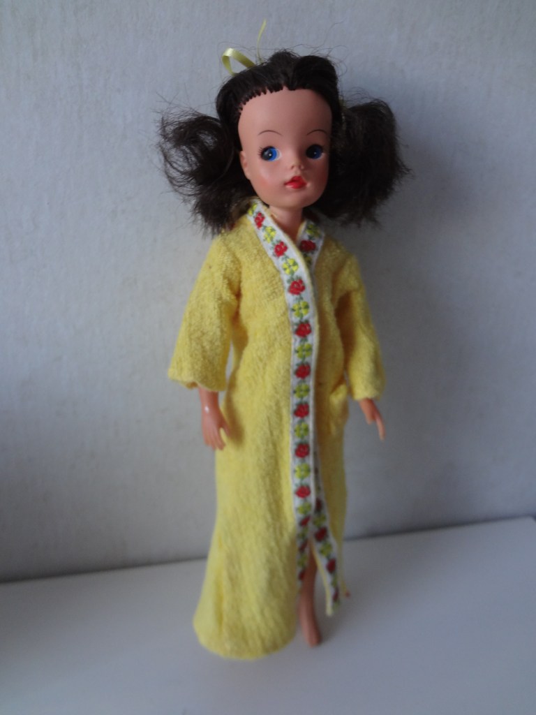 …för på Återbruket fanns även den här dockan (Susy), som jag slog till på någon tid senare, och hon har inte ledade händer så hon kan vara tidigare eller senare. Och dessa originalkläder till en Sindy ballerina kan lika väl eller t.o.m. troligare höra till den mörkhåriga dockan, och då är hon en så kallad Active Sindy!